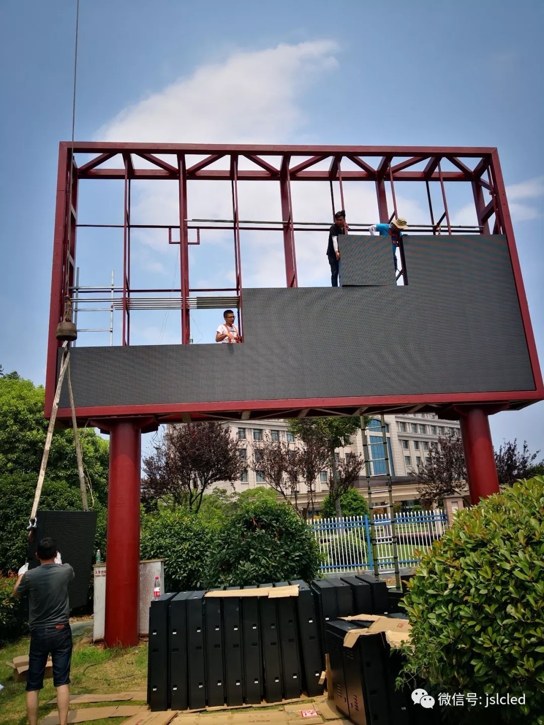 該項目由江蘇亮彩承制,負責該項目的鋼架結構設計施工以及LED顯示屏顯示系統(tǒng)的整體構建。正值盛夏,亮彩工程部也一絲不茍的完成的戶外顯示屏安裝工作,江蘇亮彩團隊始終不斷提升產(chǎn)品卓越性,完善售后服務以保障完美交付每一項顯示屏安裝工程。